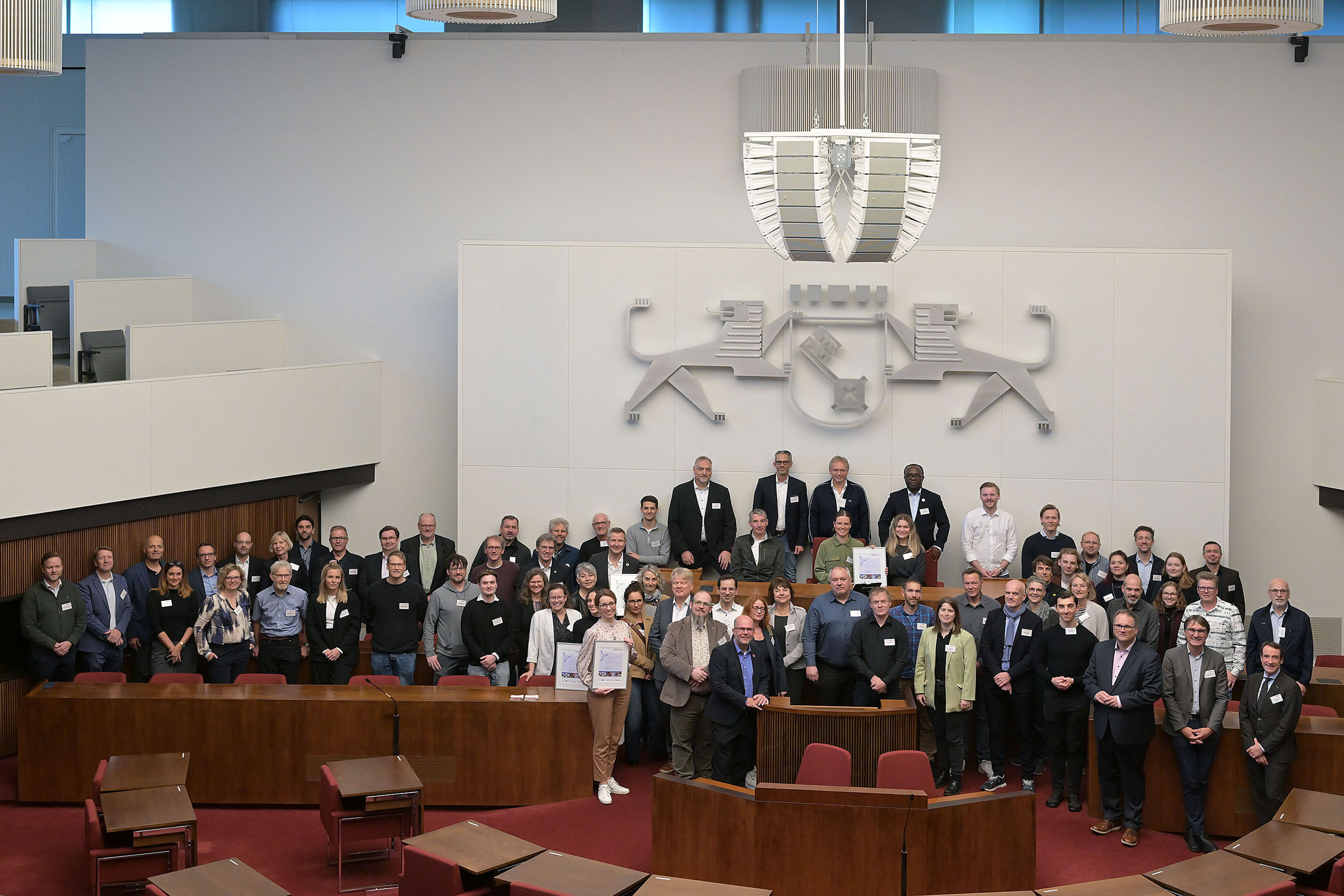 - Vertreter:innen der teilnehmenden Unternehmen präsentierten mit Fotos die erfolgreiche Baumpflanzaktion der Umweltpartnerschaft im Bremer Rathaus. © Umwelt Unternehmen, Jörg Sarbach. Foto 2 (jpg, 1.5 MB)