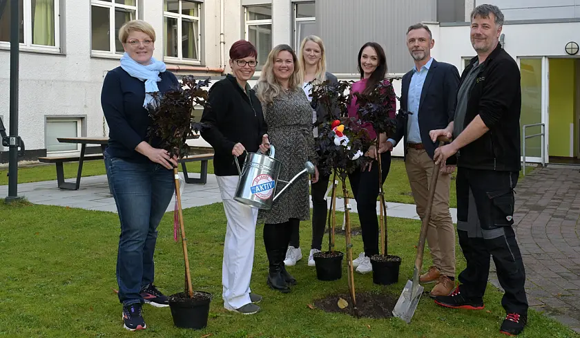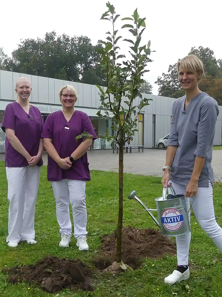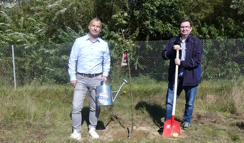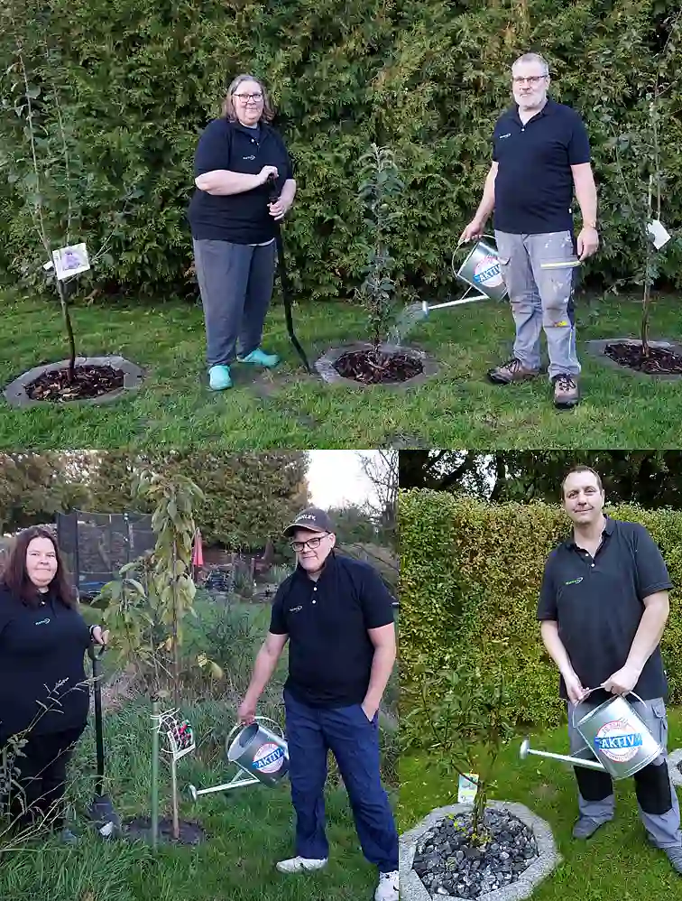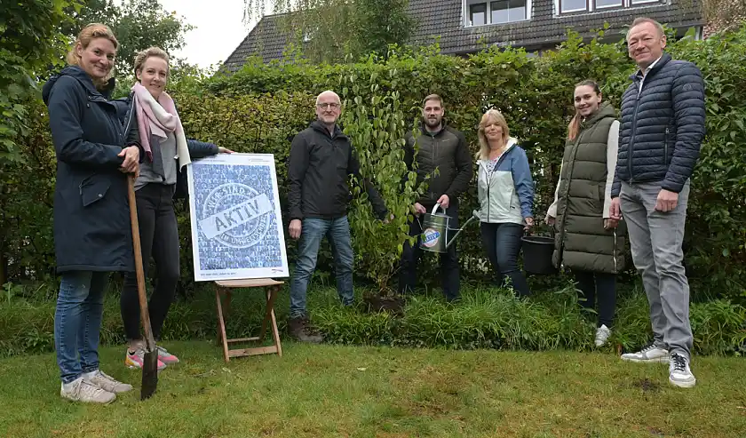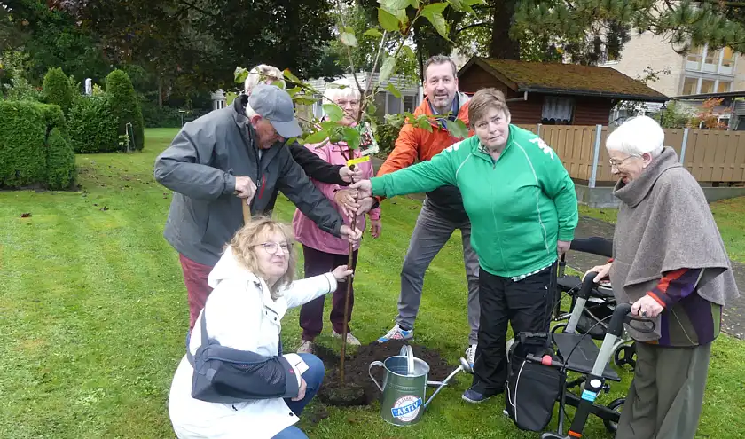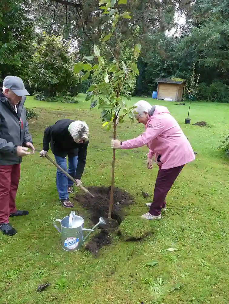 Das war einer der Gründe für die BÜHNEN GmbH & Co. KG bei der Aktion mitzumachen. "Wir haben das Gelände dafür und zudem großes Interesse daran, einen Beitrag für den Umwelt- und Klimaschutz zu leisten. Das ist auch den Mitarbeitenden im Betrieb ein echtes Anliegen", sagt Teamleiterin Marketing Heike Lau. Zum Bestand vor Ort kamen drei neue Apfelbäume hinzu. "Sie bieten Lebensraum und Nahrung für Vögel wie Insekten und gehören überdies zu den Baumarten, die uns vom BUND Bremen empfohlen wurden", erläutert sie weiter. Im Stiftungsdorf Walle der Bremer Heimstiftung feierte man die Pflanzung von drei Bäumen mit einem Umtrunk, auf dem sich bereits Baumpat:innen unter der Bewohnerschaft fanden. Melitta Felzmann und Ulrich Karth werden zukünftig abwechselnd die Bewässerung übernehmen. "Das machen wir gerne, weil sich an den Bäumen viele Menschen aus dem Haus und der Nachbarschaft erfreuen werden", sagt Felix Schauppner, Nachhaltigkeitsbeauftragter des Altenhilfeträgers.