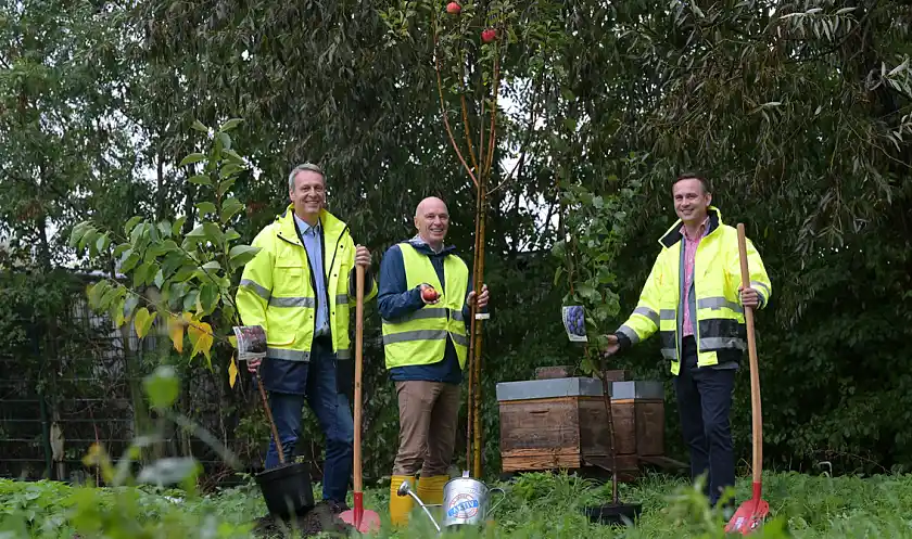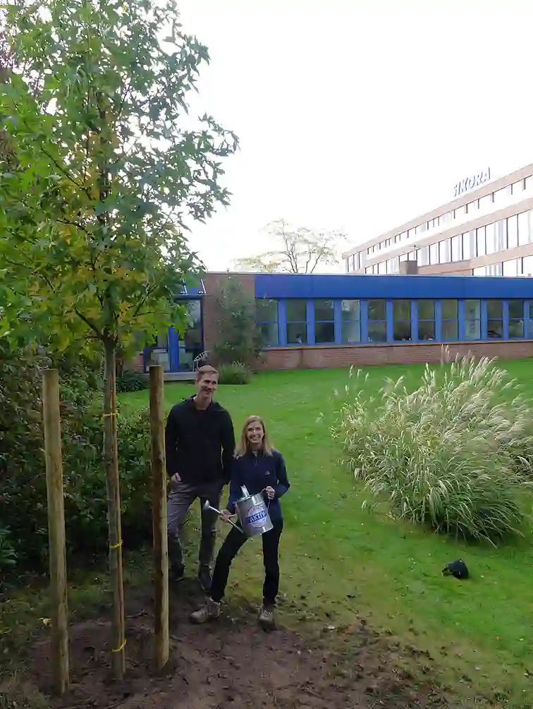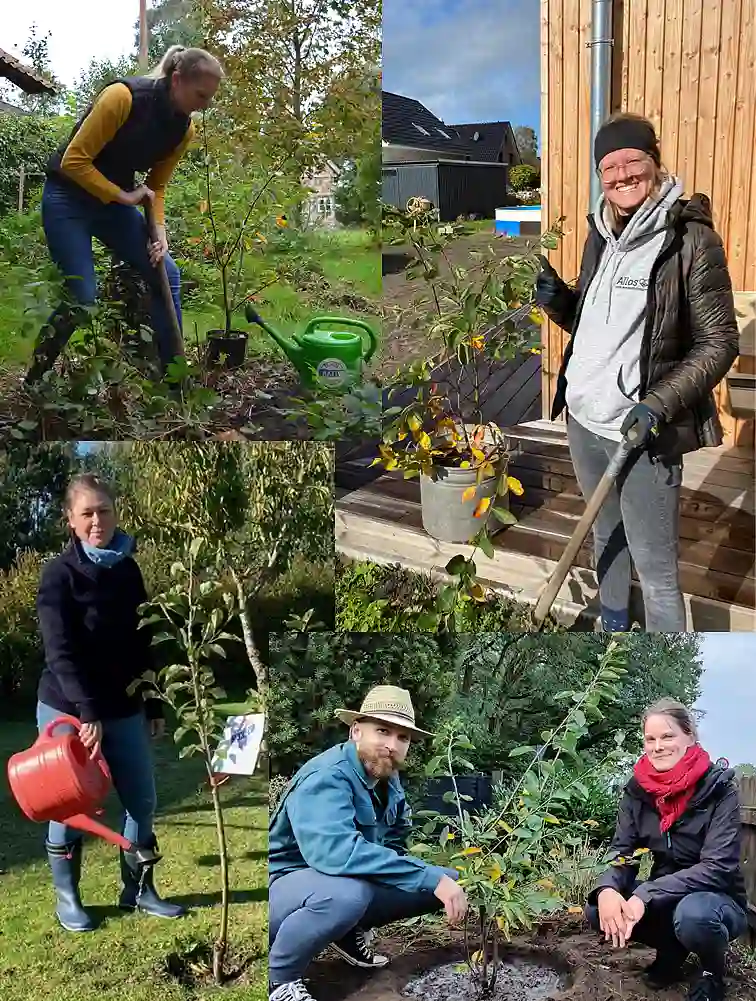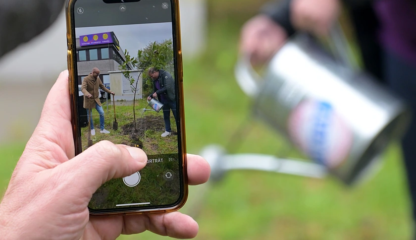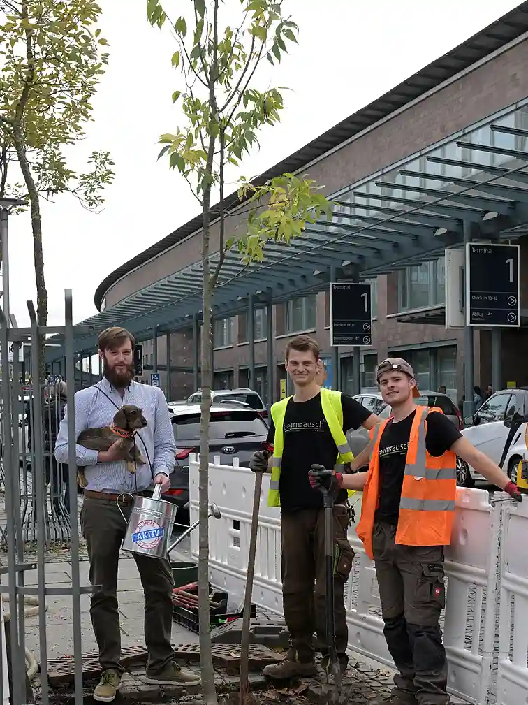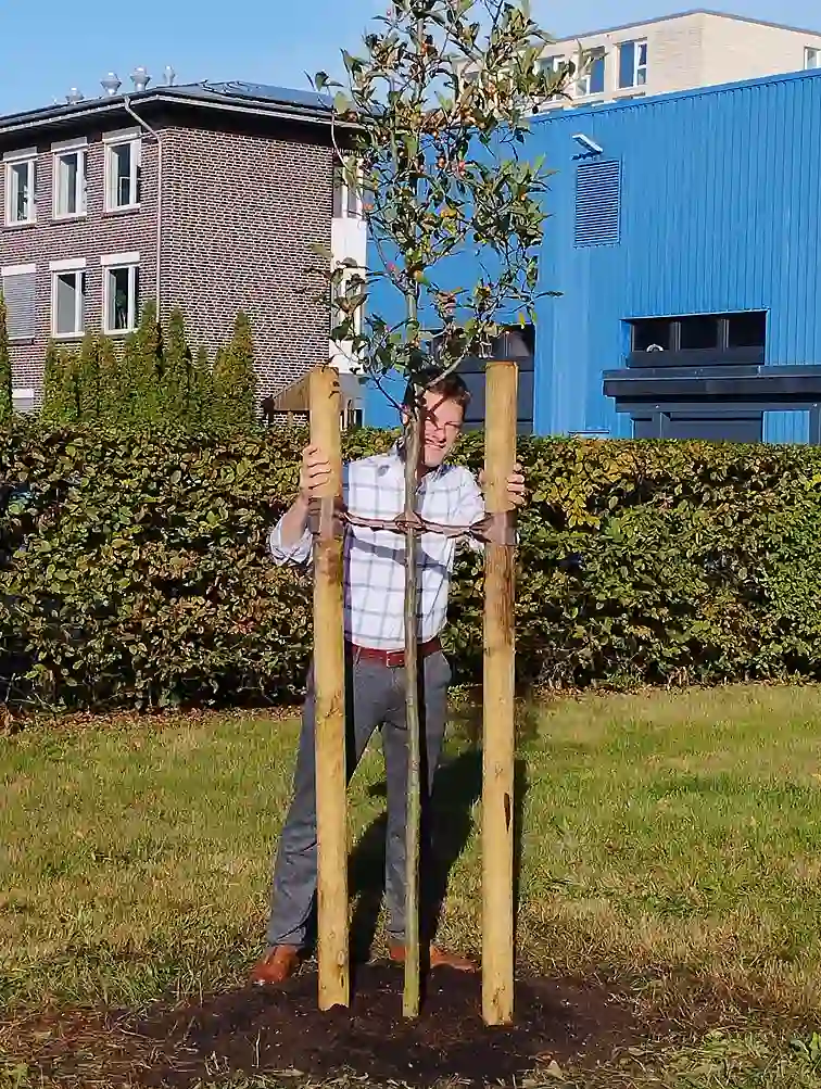 Das war einer der Gründe für die BÜHNEN GmbH & Co. KG bei der Aktion mitzumachen. "Wir haben das Gelände dafür und zudem großes Interesse daran, einen Beitrag für den Umwelt- und Klimaschutz zu leisten. Das ist auch den Mitarbeitenden im Betrieb ein echtes Anliegen", sagt Teamleiterin Marketing Heike Lau. Zum Bestand vor Ort kamen drei neue Apfelbäume hinzu. "Sie bieten Lebensraum und Nahrung für Vögel wie Insekten und gehören überdies zu den Baumarten, die uns vom BUND Bremen empfohlen wurden", erläutert sie weiter. Im Stiftungsdorf Walle der Bremer Heimstiftung feierte man die Pflanzung von drei Bäumen mit einem Umtrunk, auf dem sich bereits Baumpat:innen unter der Bewohnerschaft fanden. Melitta Felzmann und Ulrich Karth werden zukünftig abwechselnd die Bewässerung übernehmen. "Das machen wir gerne, weil sich an den Bäumen viele Menschen aus dem Haus und der Nachbarschaft erfreuen werden", sagt Felix Schauppner, Nachhaltigkeitsbeauftragter des Altenhilfeträgers.