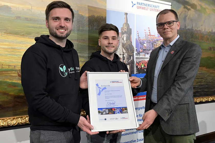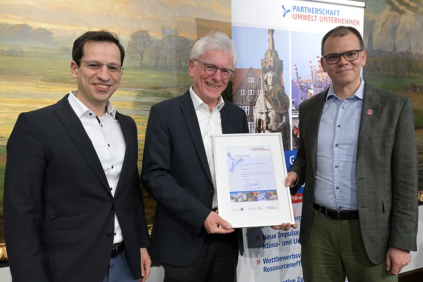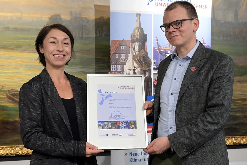 Innovative Lösungen, grüne Technik und Dienstleistungen, die zur Klimawende beitragen: Dafür stehen das Café Sand, die fleXality GmbH, die Green Circuits GmbH, die Green Fuels GmbH, die Hanseatic Treework GmbH & Co. KG, das Haus der Dokumente, die MR PlanFabrik GmbH, der Recycling-Hof Findorff und die Uwe Röhrs GmbH. Der Einsatz für den Klimaschutz dieser neun Unternehmen führte zu ihrer Aufnahme in die "Partnerschaft Umwelt Unternehmen". Bei einem Zusammentreffen im Bremer Rathaus wurden am 28. März aber nicht nur die "Neuen" im nunmehr 239 Mitglieder starken Verbund begrüßt. Jan Fries, Staatsrat bei der Senatorin für Umwelt, Klimaschutz und Wissenschaft, zeichnete überdies zwei Betriebe als "Klimaschutzbetrieb CO2 minus 20" aus: Die dextra FM GmbH & Co. KG erhielt den Titel für das Jahr 2023; das Haus der Dokumente wurde zum Klimaschutzbetrieb 2024 ernannt. Beide haben ihren Ausstoß an CO2-Emissionen innerhalb von fünf Jahren um 20 Prozent gesenkt.